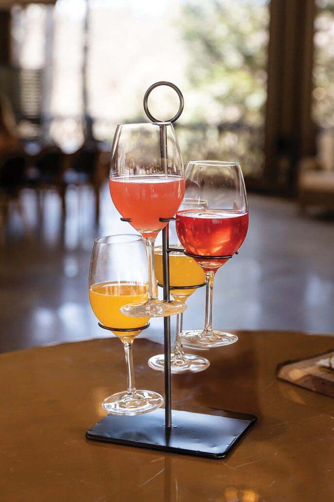 Once more, reality far overmatched my imagination – the Mimosa Collection was a bouquet of four champagne flutes vertically arrayed upon a metal form like a Rob Lorenson sculpture on loan from The Bascom. A dazzling presentation. But of course, that artistry would have all the value of a Slushie from the Kwik-E Mart if the four mimosas – a classic concoction, a peach bellini, a cranberry mimosa, and a strawberry mimosa – had been assembled with inattention and in haste.