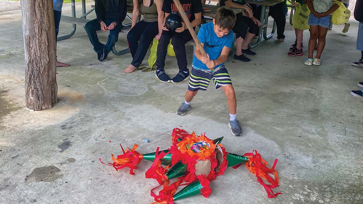 Little Brother Alex takes down the pinata at the 2021 Field Day event in June as onlooking Littles cheer him on!